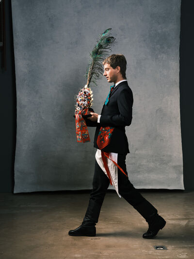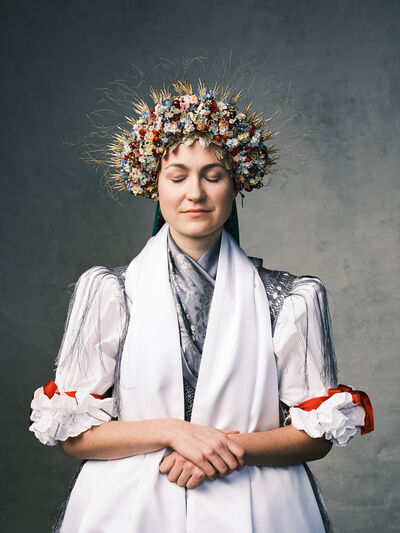 Das Sonntagsgewandgefühl ist uns dank fast unendlicher Kombinationsmöglichkeiten unserer zahlreichen, in Massenproduktion hergestellten, mehr oder weniger modischen Kleidungsstücke abhanden gekommen. Fest- und Sonntage unterscheiden sich von normalen Wochentagen kleidungstechnisch kaum. Ganz anders bei den Goldhaubenfrauen, wenn sie an hohen kirchlichen Feiertagen ihre Tracht anlegen. Kleid, spezieller Schmuck, je nach Tradition weiße Handschuhe, Beutel, Gebetsbüchlein, Rosenkranz, ein Blumenstrauß aus dem eigenen Garten und schließlich die Goldhaube, die schwarze Perlhaube oder das Kopftuch ergeben ein Gesamtbild, das dem Tag und der Trägerin eine besondere Atmosphäre jenseits des Alltags verleiht. Auf den ersten Blick erscheint diese Tracht im Korsett einer strengen Tradition. Bei näherer Betrachtung erkennt man den Spielraum für viele Details in Schnitt, Farbe, Form und Machart. Es entsteht Vielfalt in der Einheit, Individualität in der Konformität. Alle Kleidungsstücke weisen hohes schneiderhandwerkliches Können auf und sind Zeugen der großen Geduld der Herstellerinnen. Detailverliebtheit und Genauigkeit sind die Voraussetzungen für solch ein Meisterwerk. Alleine an der Herstellung ihrer Goldhauben arbeiten die Frauen über 300 Stunden. In den 434 österreichischen Goldhaubengruppen wird das traditionelle Wissen weitergegeben und wertvolle Tipps und Tricks vermittelt. So ungewöhnlich das Tragen einer Tracht heutzutage ist, so selbstverständlich wirken die ca. 60 Trägerinnen auf den über 100 Fotografien der Portraitserie Golden Blossoms. Als Fotograf konzentrierte ich mich auf ein ausgewogenes Verhältnis von Inszenierung und Authentizität. Im Zentrum dieses Spannungsfelds standen die Protagonistinnen mit ihren individuellen Eigenschafen, Vorlieben und Entscheidungen. Die reduzierte Umgebung die schlichte Lichtführung unterstreichen die Bedeutung der Dargestellten. Der Anspruch vieler Fotografen, dass ein Porträt die Persönlichkeit, die Seele einer Person einfangen sollte, trifft in gewisser Weise auch auf die Goldhaubenträgerinnen zu, geht jedoch nur so weit, wie diese einen Einblick in ihr Inneres zuließen. Informationen über ihren Charakter bleiben vage oder verborgen. Lediglich ihr Stolz auf die Tracht und die Würde, die durch die besondere Kleidung unterstrichen wird, kommen zum Vorschein. Die Blickrichtung der Frauen – üblicherweise die Bindung zwischen Betrachter und Dargestelltem – variiert. Zurückhaltend und doch präsent, skeptisch, streng, freundlich, ehrlich, unabhängig, vor allem aber selbstbewusst blicken die Damen in und neben die Kamera. Ihre traditionelle Kleidung lässt vorerst auch auf konventionelle vergangene Frauenrollen schließen, ihr Ausdruck und ihre Haltung aber zeigen ihre Präsenz in der Gegenwart, eigenständig, sozial vernetzt – im besten Sinn emanzipiert.